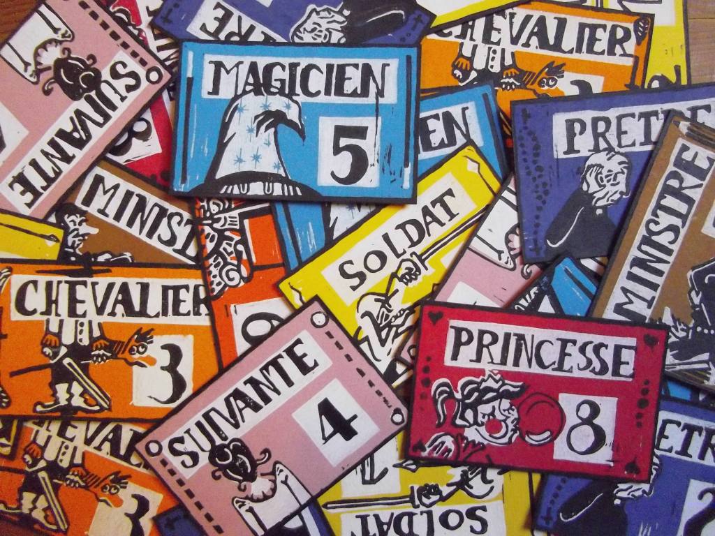 jeu de la princesse gomme gravée, 2 couleurs réinterprétation du jeu « Love Letter » de Seiji Kanai, édité chez Filosofia Similaire Mots-clés: edition, gravure, jeu